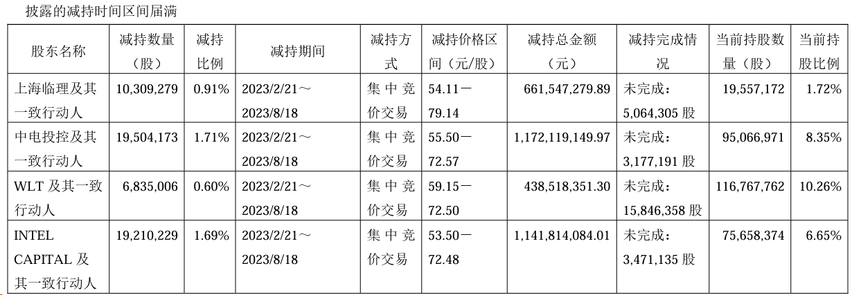 减持期间内,除上述集中竞价交易外,上海临理及其一致行动人通过询价转让及大宗交易方式合计减持3.03%的股份,上海临理投资合伙企业通过非交易过户方式进行股票实物分配0.64%的股份;中电投控及其一致行动人通过询价转让方式减持2.50%的股份;INTEL CAPITAL及其一致行动人通过询价转让及大宗交易方式合计减持0.61%的股份。