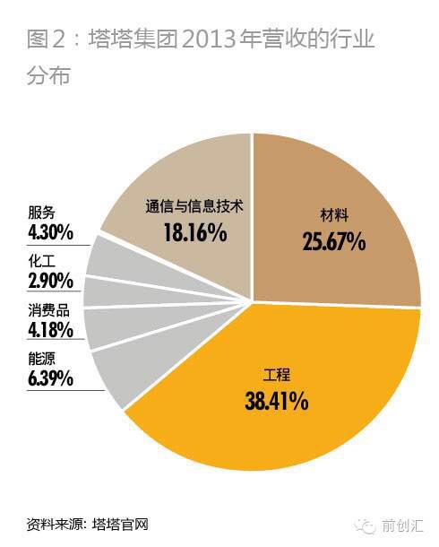 在家族历代的努力经营下,塔塔集团成为真正意义上的全球性集团,2013年度总营收达968亿美元。分行业来看,包括汽车制造、机械设备制造在内的工程领域营收占比高达38.51%,材料以25.67%的营收占比居第二,高科技行业(通信与信息技术)次之,能源、化工、服务和消费品相对贡献较小(图2)。