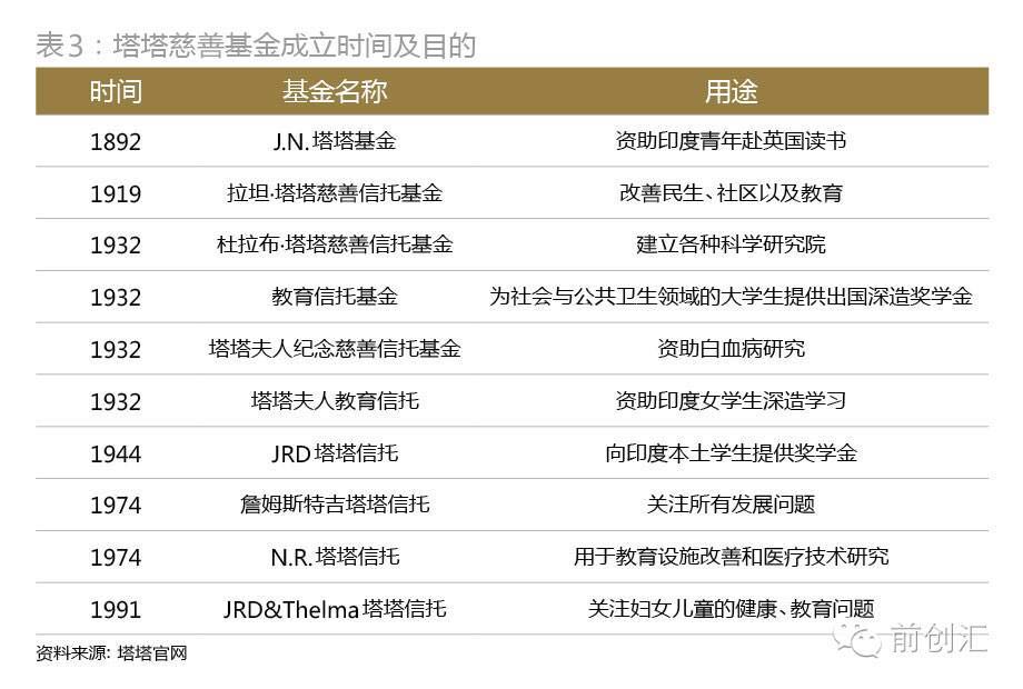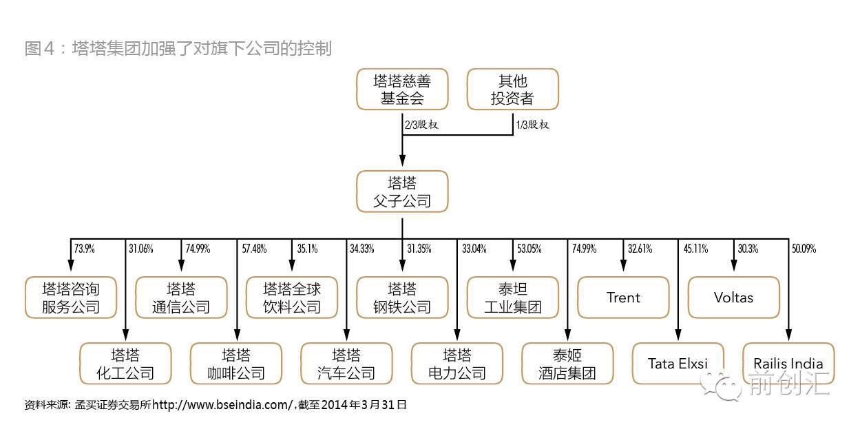 塔塔家族上百年来能够保持对整个集团产业的掌控,塔塔慈善基金会起着重要的作用,它旗下的子基金合计持有塔塔之子公司2/3的股权,而塔塔之子公司则掌舵整个家族产业的方向,具有三重主要职责:1.持有主要营运公司股份;2.通过投资促进部分运营公司业务成长;3.帮助集团开拓新业务领域。