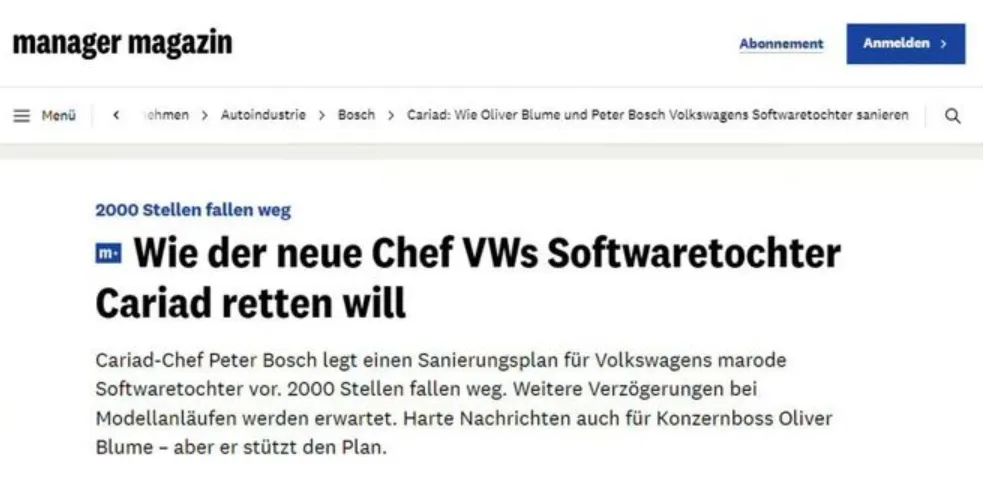 2023年5月8日,大众汽车集团对CARIAD进行了全面重组,包括首席执行官、首席技术官、首席财务官等在内的大多数高管都被解雇,原宾利董事彼得·博世接任了CARIAD部门的CEO职务。