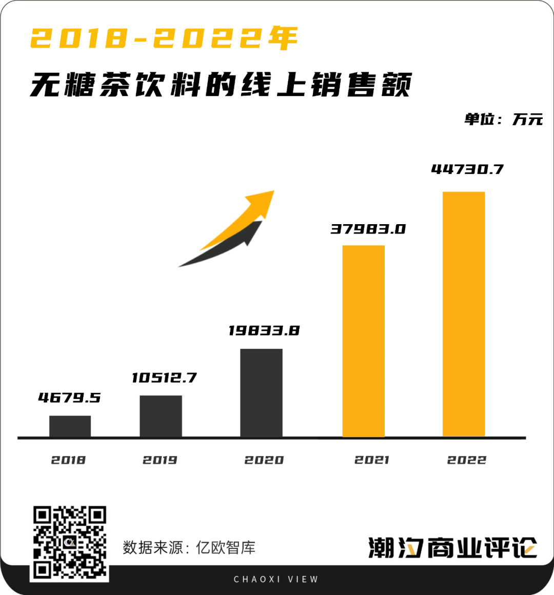 无糖茶饮的市场呈现迅猛增长趋势,据亿欧智库《2023中国无糖茶饮行业白皮书》显示,2018年-2022年无糖茶饮料的线上销售分别为4679.5万元、10512.7万元、19833.8万元、37983.0万元、44730.7万元,短短五年时间消费额翻了近10倍。