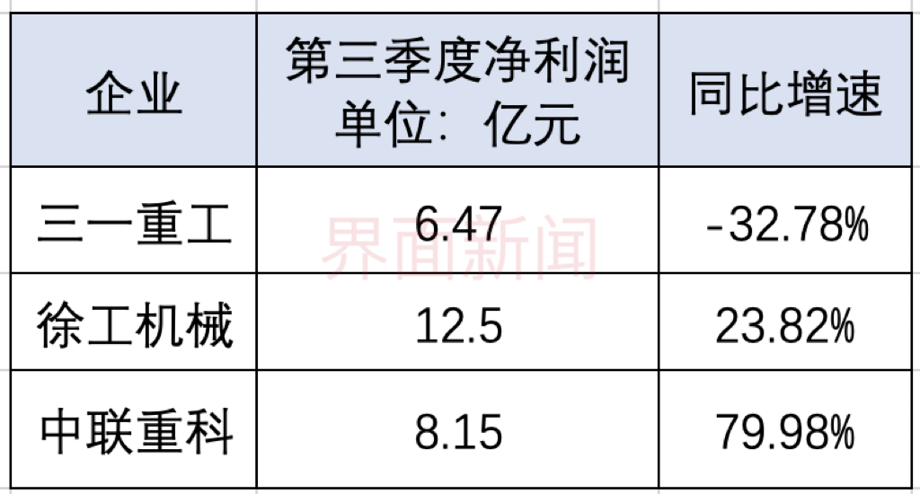 今年前三季度,三家工程机械龙头均实现了净利增长,但单季看,三一重工(600031.SH)出现业绩下降,中联重科(000157.SZ)净利增幅较大。