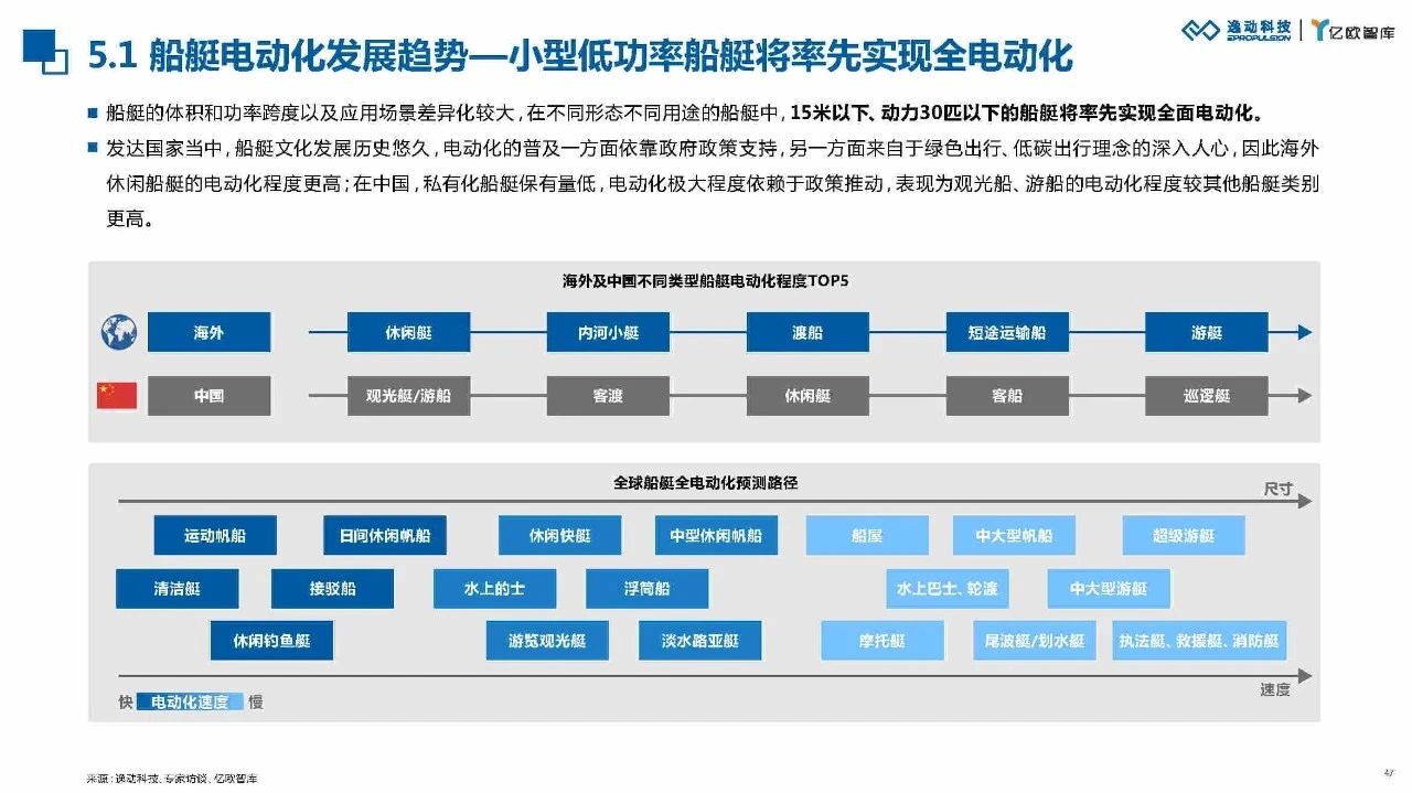 船艇种类划分繁杂,从小型的休闲钓鱼艇,到中大型游艇,不同形态不同用途的船艇自动化程度不同。简单来说,就是体型越小、动力需求越小的船艇越容易实现电动化。