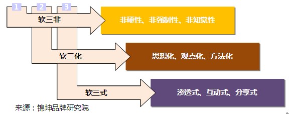 那要怎么系统的去理解软传播呢?锦坤研究院通过研究把“软传播”分析为“软三非”、“软三化”和“软三式”。