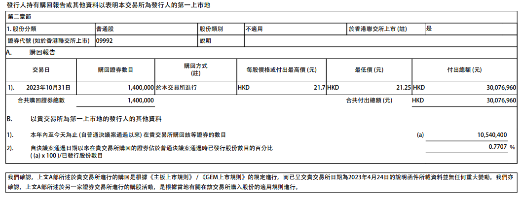 泡泡玛特10月31日在港交所公告,公司10月31日耗资3007.7万港元回购140万股公司股份。每股回购价格为21.25港元-21.7港元。