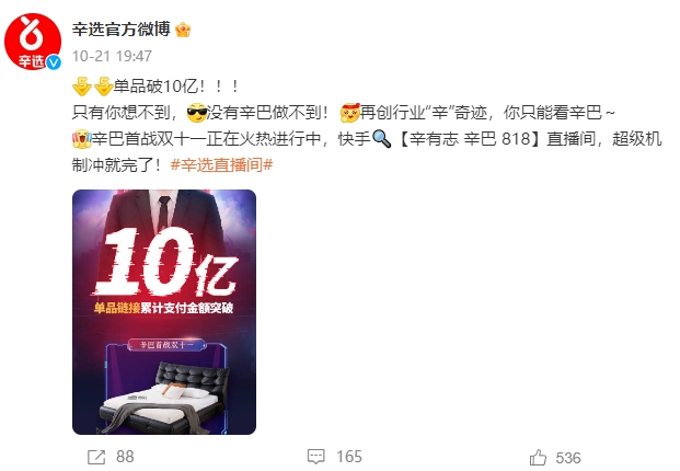 “快手一哥”辛巴不知是看“底价之争”觉得自己没存在感,还是为了给双11“造势”,又一次赶在双11开始前宣布“退网”。嘴上说退网,然后自己再找补回来,热搜也上了,大促一开始10月21日辛巴就开始“抢跑”,开启爆品清单大促直播,首战的一款慕思真皮床单品销售额超过10亿元。