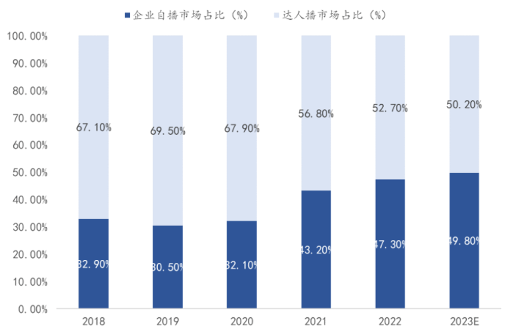 事实上,不仅是丰丝,许多品牌对头部主播都是“爱恨交织”。头部主播曾经缔造的“销量神话”仍历历在目,但面对没有主导权的局面,大部分品牌商家只能是望而却步,选择逐渐远离头部主播。因此,“去头部主播化”似乎已经成为了品牌和平台一致的目标。据艾瑞数据,2023年企业自播的成交额占比将达 49.8%,与达人播各占半壁江山。