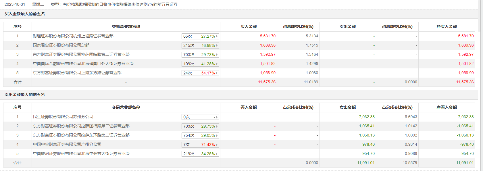 10月31日,腾龙股份今日涨停,全天换手率达21.22%,振幅达7.35%。龙虎榜数据显示,营业部席位合计净买入484.35万元。其中,财通证券杭州上塘路证券营业部、国泰君安证券总部分别买入5581.70万元、1839.98万元;民生证券苏州分公司、东方财富证券拉萨团结路第二证券营业部分别卖出7032.38万元、1065.41万元。