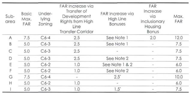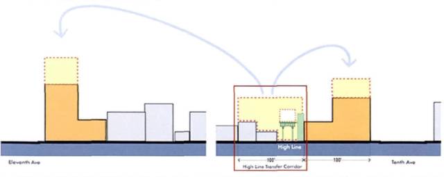 高线公园改造计划的核心是公园的建设和运营,这其中非盈利机构 “高线之友” 在整个计划中的运作功不可没。而市议会、纽约城市规划局、地面交通部、纽约市最高法院,及纽约经济发展部联合制定的 “高线转换廊道”(High Line Transfer Corridor)则是保证整个改造计划得以成功的神来之笔。高线转换廊道允许廊道内的土地所有者将一部分开发权出售,转移到周边的新建区块内用以居住和商业功能开发,而开发商保证每获得1㎡建筑面积奖励,就要付50美金用于高线公园的发展建设。并且开发商可以通过建设保障性住房、提供发展资金等途径将原先地块内的容积率从5.0-7.5提高到6.0-12.0。这一策略的制定极大的提升了开发商的积极性,并且很好的平衡了公共资源和私有土地开发的关系。