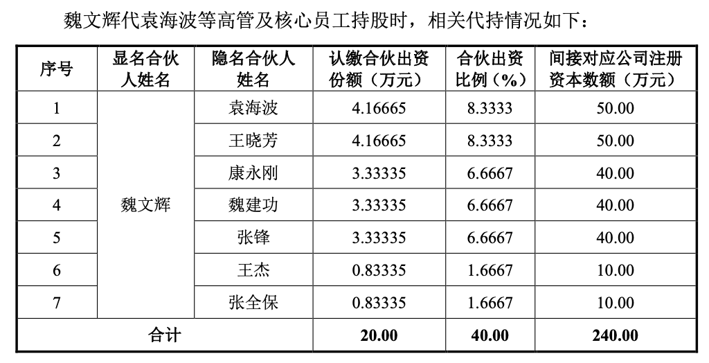 同样,在魏文辉作为公司实际控制人之初,为了保持公司核心团队与股权架构的稳定性,成员一共包括袁海波、王晓芳、康永刚、张锋、魏建功、王杰、张全保7名,为实现股权激励。2017年2月,魏文辉通过代前述核心团队成员持有瑞和晟辉的股权,具体情况如下: