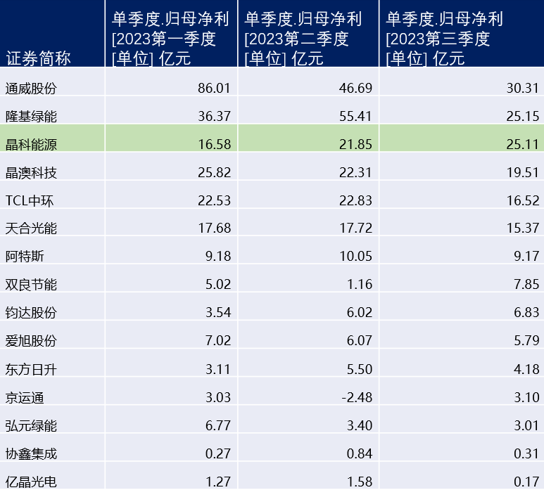 第一,晶科能源第三季度的净利润,几乎和光伏市值第一的企业——隆基绿能持平,都是25亿元。即使放眼光伏全产业链,他们第三季度的净利润,也仅屈居于硅料龙头通威股份之下。