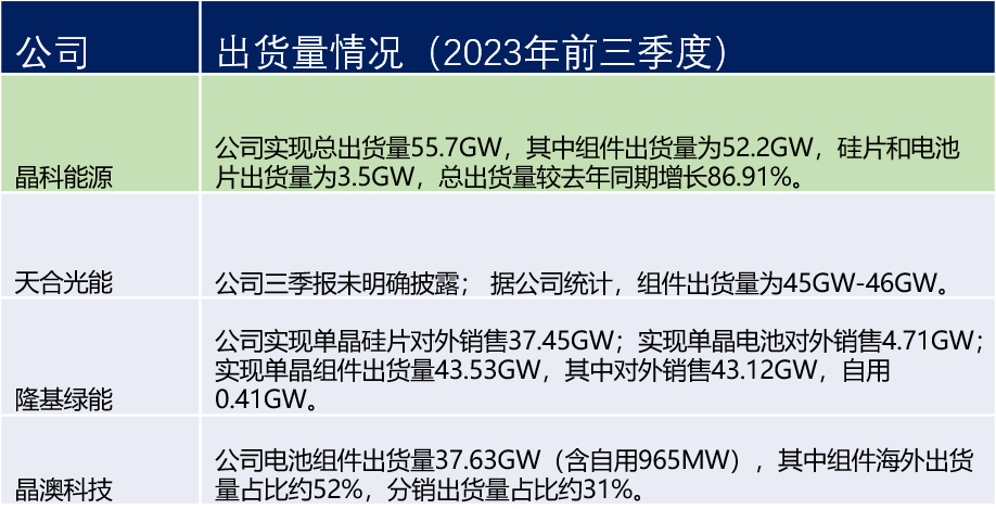 第四,组件出货量第一。晶科能源前三季度公司实现总出货量55.7GW,其中组件出货量为52.2GW。天合光能回复赶碳号,今年前三季度公司组件出货量约在45-46GW。隆基绿能前三季度实现单晶组件出货43.53GW。风格一向稳健的晶澳科技从去年开始就无意于在出货量上争高低,选择保利润保现金流,其前三季度电池组件出货量37.63GW。