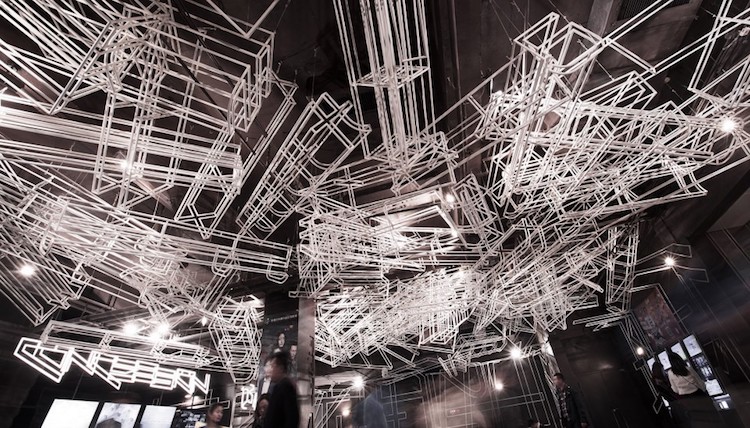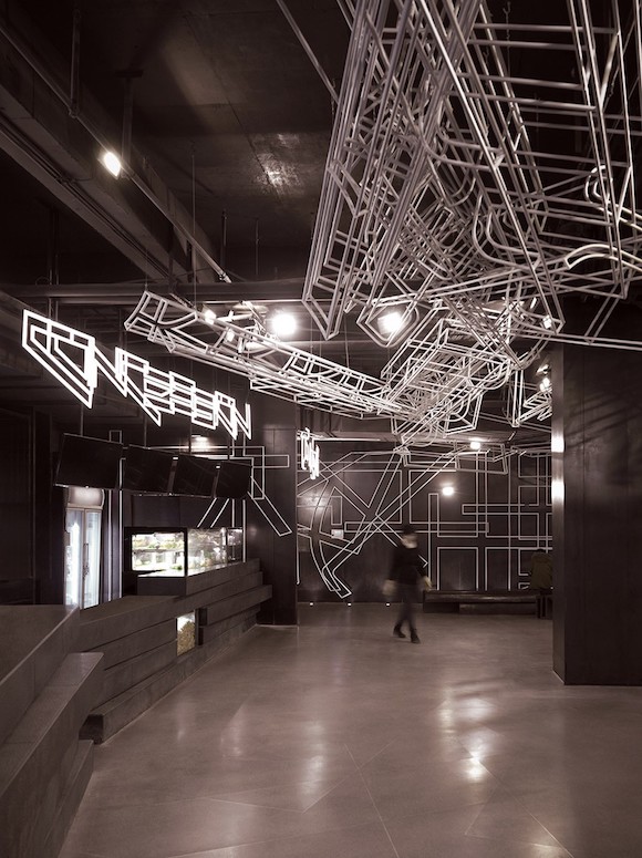 不过,只把文字放大显得没有新意和设计感,所以设计师选择将汉字拆解开来,以打乱的偏旁部首相互叠加、摆放,有的做单纯的装饰,有的做灯管,有的做长凳......视觉效果和实际功能丰富又有趣。正如设计说明中所说,这种“用部首的意念,以不同的形态在场内纵横,能令观众进入各自的幻想世界,创造出属于他们的剧本”。