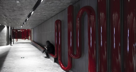 声波是个抽象的概念,因此设计师也巧妙地将不同功能区和不同密度的声波曲线做了匹配。就好像人流涌动的走廊,声波曲线蜿蜒曲折,密密麻麻,从天花板落下,又射向远方;而到了人流量少些的候映区,声波就化作一根直线,观众可以坐在这根直线上,享受片刻的“安静”。
