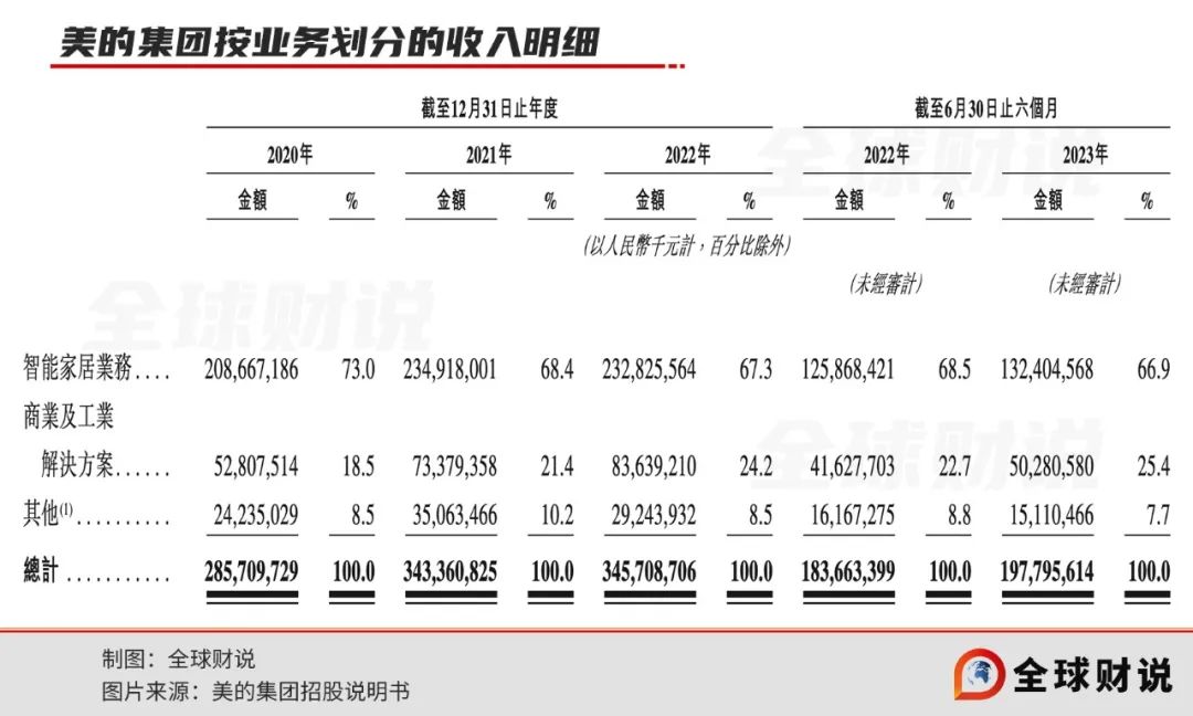 其中,智能家居业务各期的收入分别为2086.67亿元、2349.18亿元、2328.26亿元及1324.05亿元,2022年同比减少0.89%。