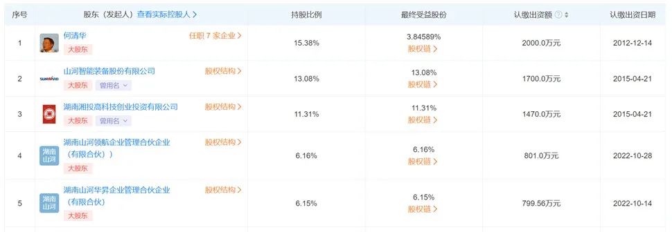 据悉,截至当前,在山河星航股权结构中,创始人何清华为控股股东、实际控制人,直接持股比例为15.38%股份,通过两家合伙企业湖南山河领航企业管理合伙分别控制公司6.16%和 6.15%股份,合计持股比例为27.69%,并且拥有山河星航 54.03%表决权,为公司实际控制人。