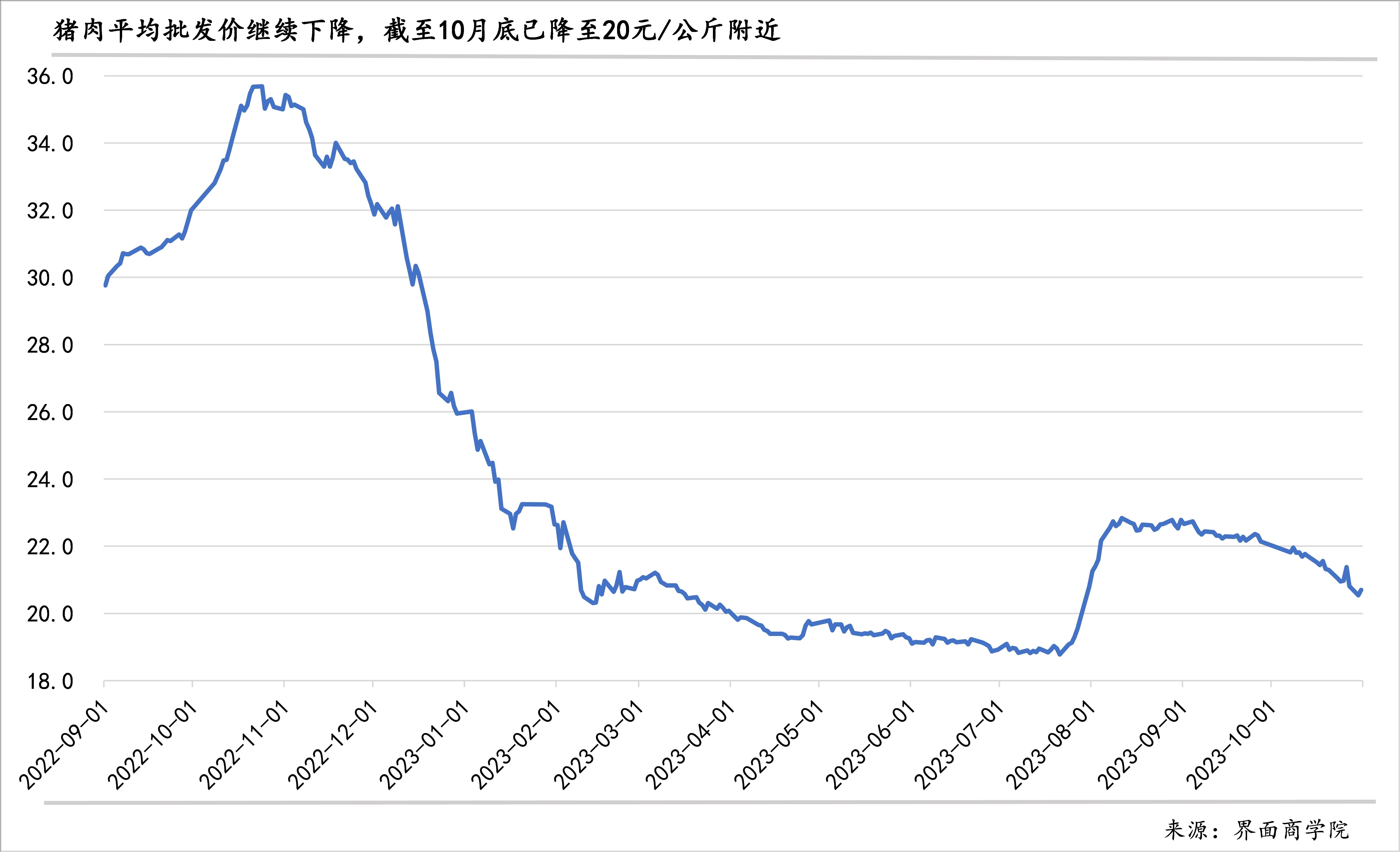 猪肉价格继续走低。猪肉平均批发价在10月份继续下降,到10月31日降至20.7元/公斤,简单估算月度均值,10月同比降幅较9月份扩大逾10个百分点、10月环比降幅扩大4个百分点至4.4%。