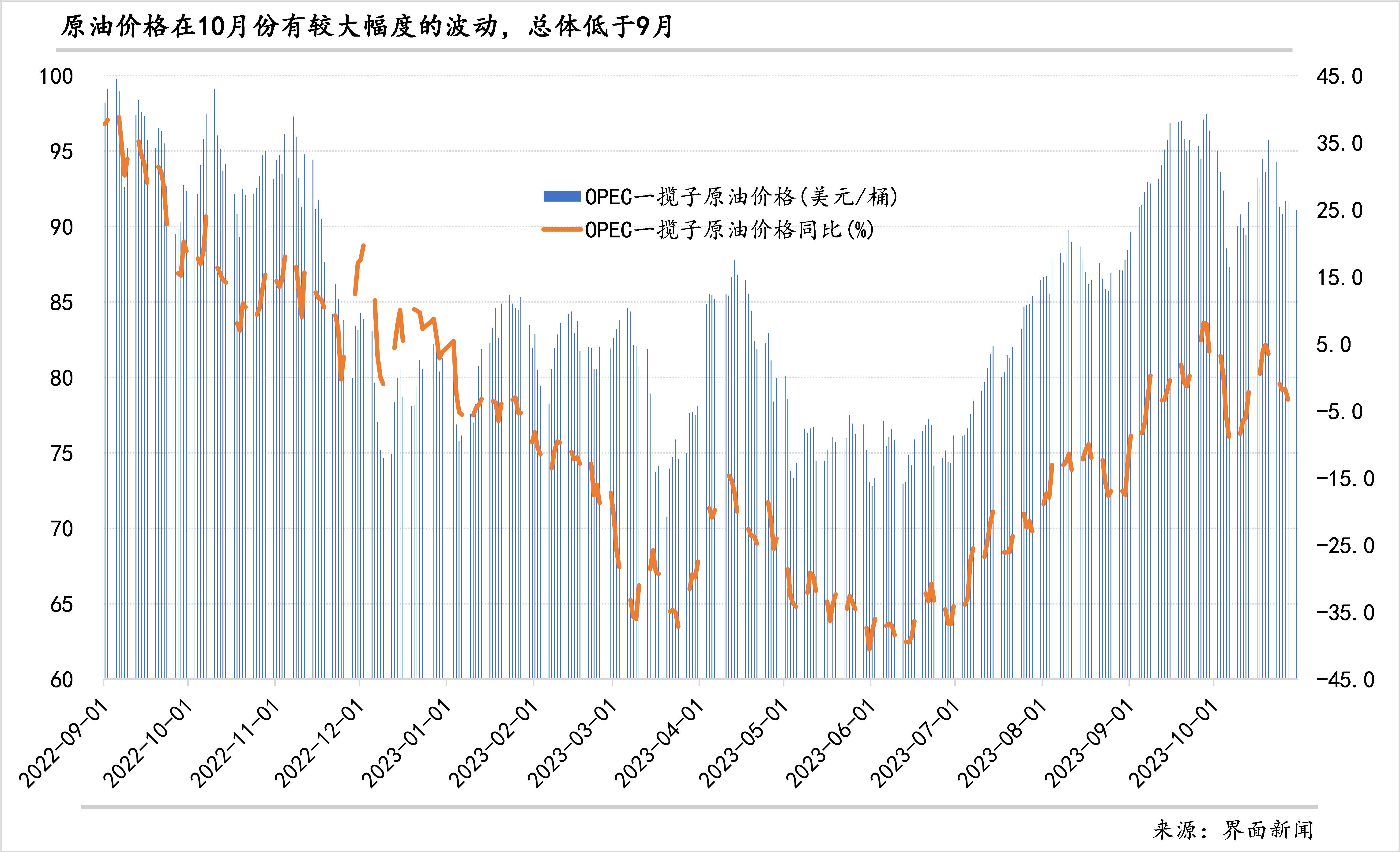 原油及成品油价格在10月有所下降:9月底到10月上旬原油价格明显下降,以色列与哈马斯在10月8日爆发冲突后,原油价格一度回升,10月20日以来,因为加沙冲突暂未扩大、欧洲经济表现不太理想,油价再次回落。