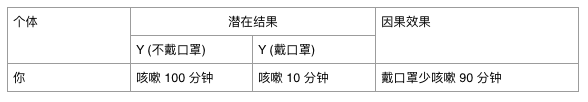 在上面的例子中,作用在个体“你”上的因果效果就是戴口罩咳嗽 10 分钟 - 不戴口罩咳嗽 100 分钟 = 少咳嗽 90 分钟。我们用符号 Y 来表示潜在结果,Y(不戴口罩) 和 Y(戴口罩) 分别表示两个不同处理(戴 or 不戴口罩)情况下的潜在结果。