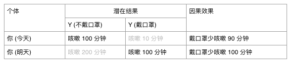 如果你没有戴口罩,今天痛苦地咳嗽了 100 分钟(会不会挂掉?),你会很后悔地想:要是我今天记得戴口罩,那么我可能只会咳嗽 10 分钟。戴口罩的话你会咳嗽 10 分钟,不戴口罩的话你会咳嗽 100 分钟,咳嗽 10 分钟和 100 分钟分别就是这两个处理所对应的潜在结果。