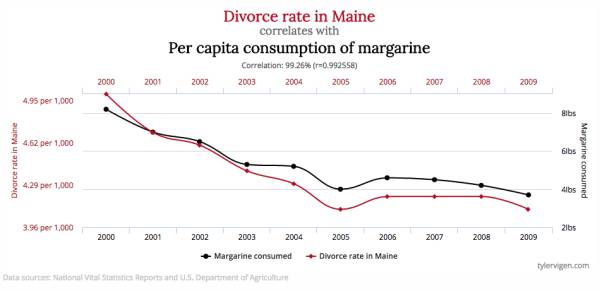 上面的例子中,美国缅因州的离婚率和人均黄油消耗量在 2000 年至 2009 年间达到了极强的相关性(相关系数 0.9926)。吃黄油和离婚明显是没有因果关系的两件事,因为根据我们的常识,吃多点黄油不至于让人性情大变而导致离婚,离婚之后也不太可能因为心情沮丧而多吃黄油。