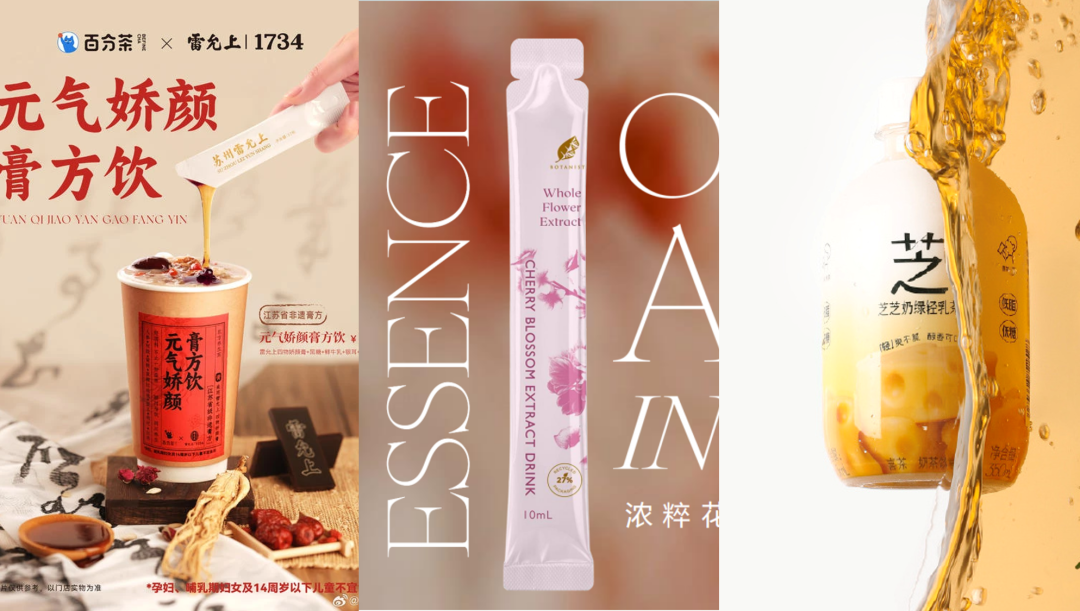 除了滋补外,养颜产品也相继上线。新茶饮里面,「百分茶」和「雷允上」联名,推出「元气娇颜膏方饮」,选用雷允上四物娇颜膏,内含人参、阿胶、黄精、重瓣红玫瑰,非遗膏方搭配养生小料,绵软香甜,一杯暖心暖胃。「喜茶」推出「芝芝奶绿轻乳茶」,特别添加胶原蛋白肽。