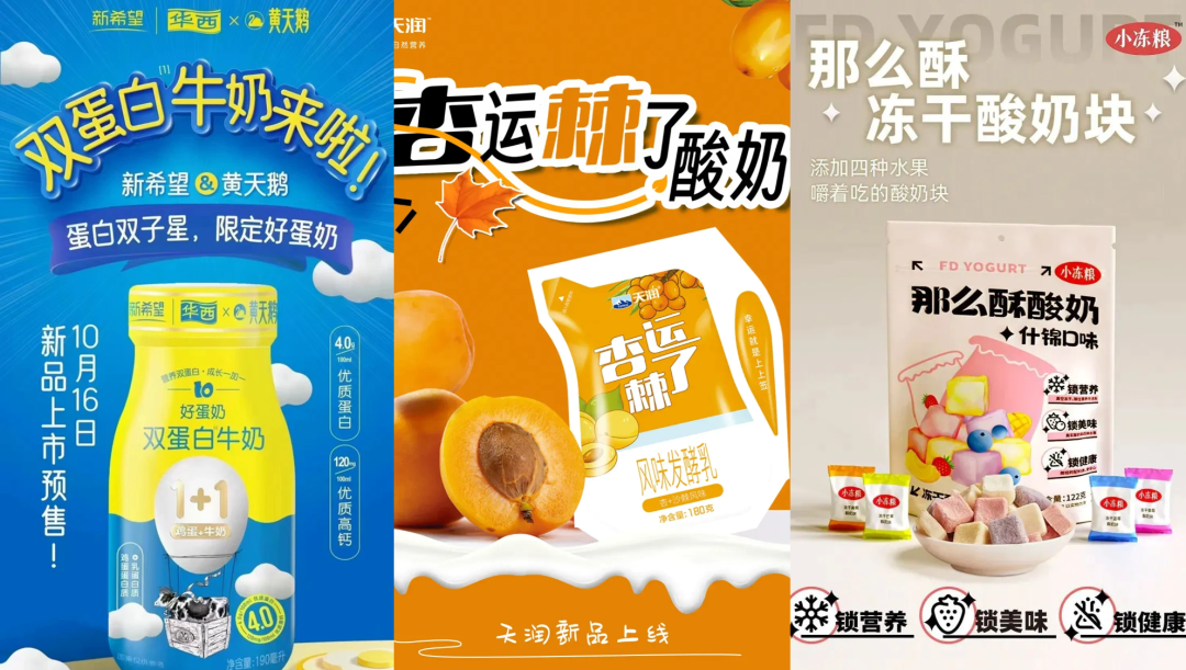 「天润」上线「杏运棘了酸奶」,沙棘酱+金太阳杏酱+优质奶源,三重搭配强调高维C。「好想你」旗下「小冻粮」推出「那么酥冻干酸奶块」,扩大酸奶食用方式。