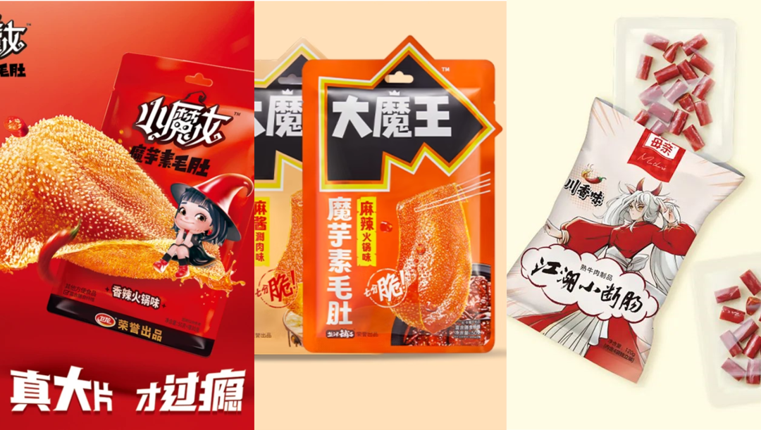 辣味零食领域,「卫龙」和「盐津铺子」先后推出魔芋素毛肚产品,占位魔芋零食赛道。卫龙「小魔女」强调大片魔芋片,盐津铺子「大魔王」也是片状,但包含多口味和多规格,旨在全面覆盖市场。