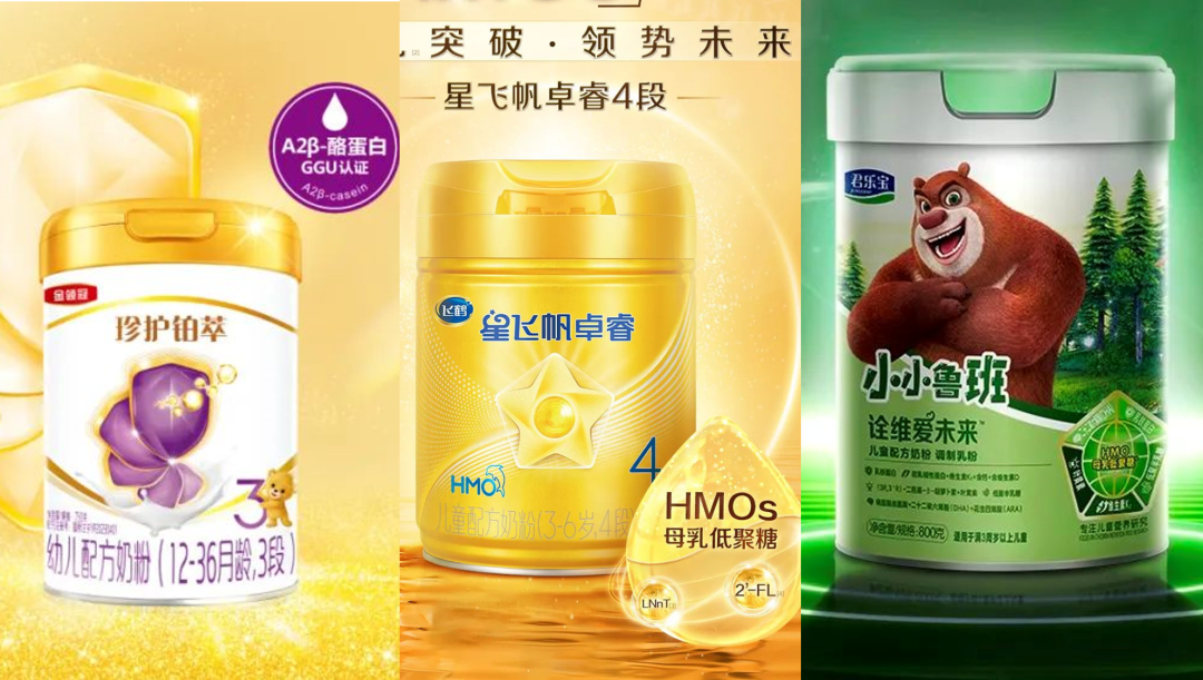 「伊利金领冠」推出「珍护铂萃儿童成长配方奶粉」,采用0.1%伊利专属牧场鲜活A2型生牛乳,含有HMOs、珍稀乳铁蛋白和超级三代OPO。「飞鹤星飞帆卓睿4段」,同样添加HMOs。「君乐宝」推出「小小鲁班“诠维爱未来”HMO奶粉」,采用HMO-2’-岩藻糖基乳糖,配方中还含有乳铁蛋白、玉米黄质、双益生元FOS+GOS、DHA等营养元素。「完达山」则推出首款有机A2奶源HMO儿童奶粉,与前三者打出差异化。