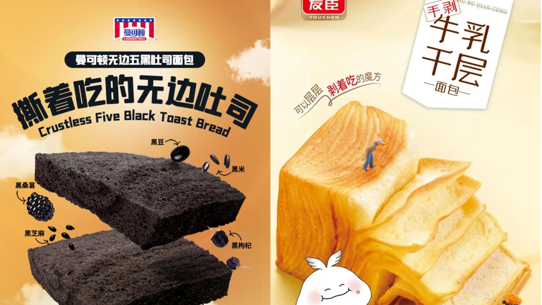 「曼可顿」推出「无边五黑吐司面包」,产品添加黑豆、黑米、黑枸杞、黑桑葚和黑芝麻,去除烘烤硬边,纵享面包松软体验。「友臣」推出「手剥牛乳千层面包」,采用中种法冻面工艺和24层起酥工艺,每一层都充分发酵烘烤,可以一层一层撕着吃,适合早餐、户外充饥等多种场景。