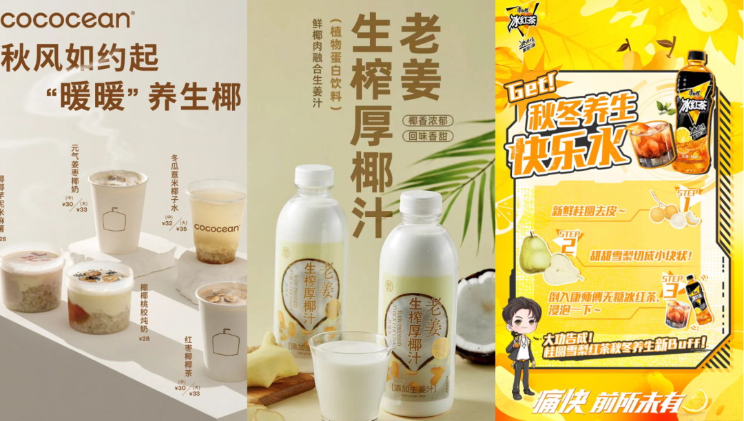 「cococean」上新「秋冬养生椰」系列茶饮新品,将桃胶、红枣、小黄姜、枸杞和薏米与椰子强强结合,推出红枣椰椰茶、元气姜枣椰奶、椰椰桃胶炖奶等5款产品。「盒马」上新「老姜生榨厚椰汁」,采用鲜椰肉融合生姜汁,入口回甘,滑细腻,带着醇厚生姜味。从场景营销角度,「康师傅无糖冰红茶」也开发出养生喝法,准备去皮新鲜桂圆和小块雪梨,在无糖冰红茶中浸泡后就得到一杯秋冬养生快乐水。