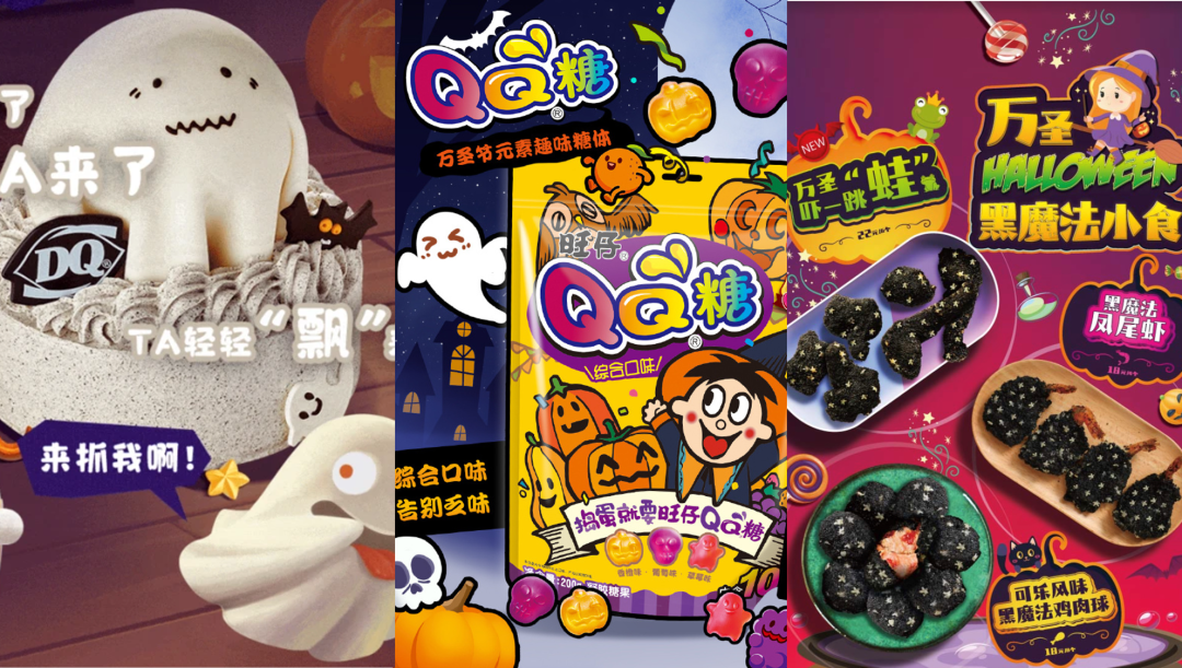 「好利来」与「Hello Kitty」推出「可爱鬼鬼」和「可爱幽灵」甜品,产品呈现出可爱的幽灵和骷髅形状。「DQ」推出「小幽灵造型蛋糕冰淇淋」,采用巧克力翻糖“外衣”,好吃好玩。「旺旺」推出万圣节元素「趣味QQ糖」,糖体是可爱的南瓜头、骷髅头和小幽灵形状,包装也充满万圣色彩。「达美乐」推出「万圣黑魔法小食」,三款产品都是黑色外壳,由墨鱼汁制成,主打黑色幽默。