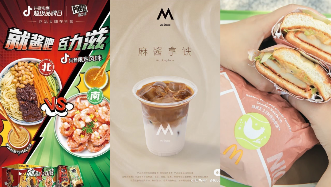 「百力滋」推出「南北蘸酱礼盒」,饼干棒有麻辣炸酱面味+桂花龙井虾仁味,北方经典口味碰撞传统江南风味,同时配有南北代表的麻酱和桂花蜜酱,谐音“就酱吃(就这样吃)”,拿捏消费者喜好。「M Stand」推出「麻酱拿铁」,产品中含有芝麻酱和花生酱,为拿铁带来不一样的中式味道。「麦当劳」推出「麻酱芝士风味板烧鸡腿堡」,产品中加入中式麻酱和西式芝士,在口味上两者融合协调,麻酱风味突出。