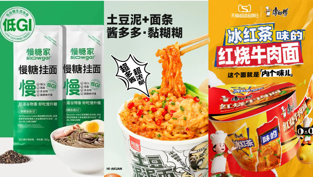 「阿宽」推出「土豆泥泥面」,采用土豆泥+面条的双重碳水组合,带来速食泡面新体验。无独有偶,「嗨吃家」推出「夜猫见面」杯面小食,采用了咖啡+泡面的神奇组合,面条添加可可粉,汤底以生椰拿铁粉+椰粒包+白糖包制成,小杯分量解馋又提神,扩大杯面应用场景。「康师傅」将旗下两款经典单品糅合,推出「冰红茶味的红烧牛肉面」,小种红茶+红烧牛肉,带来前所未有的新奇口感。