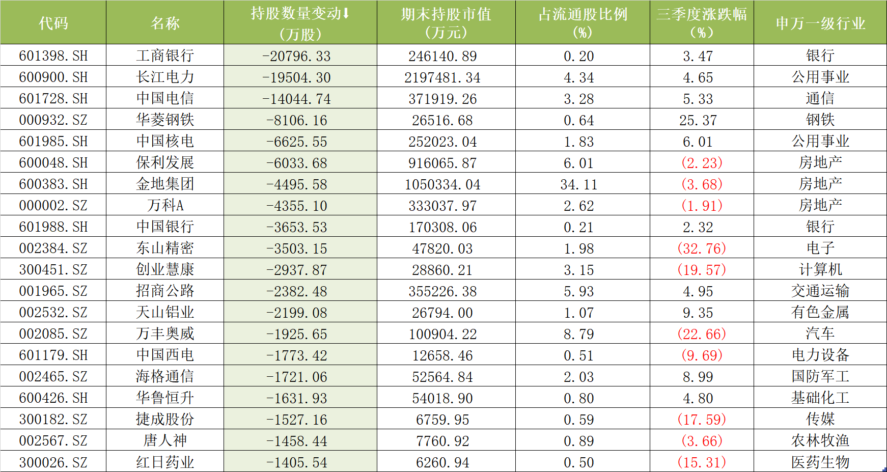 三季度险资减持个股情况方面,报告期内,共计181只个股遭险资整体减仓。其中,28只个股险资整体“坎仓”超1000万股,工商银行(601398.SH)、长江电力(600900.SH)和中国电信(601728.SH)险资减持股份数则分别达到2.08亿股、1.95亿股和1.40亿股。