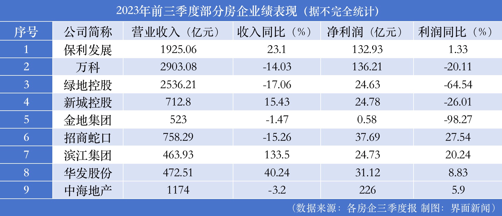 整体来看,头部房企中,前三季度保利发展、万科和中海地产的归母净利润均超百亿元,保持“领头羊”的地位;同时保利发展、滨江集团、华发股份三家企业在前三季度实现营收和利润双增长。