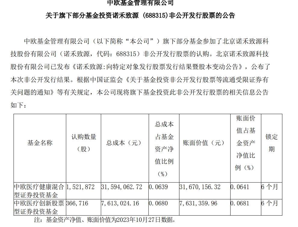中欧基金10月31日发布公告称,葛兰管理的两只产品——中欧医疗健康和中欧医疗创新参加了诺禾致源非公开发行股票的认购,认购数量合计188.86万股,总成本为3920.71万元,截至10月27日账面价值为3930.15万元。由此推算,定增的成本价约为20.76元/股。