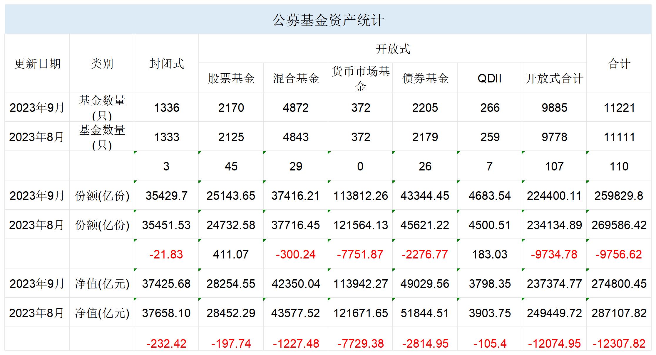 从基金数量来看,总数量为11221只,相比8月底的11111只增加了110只。这主要归功于股票基金、混合基金、债券基金,三者9月份分别增加了45只、29只、26只。