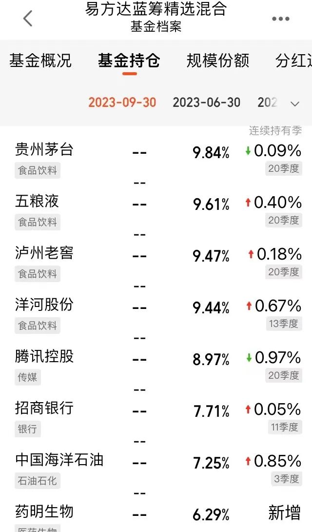 张坤的易方达蓝筹前五大重仓股为贵州茅台、五粮液、泸州老窖、洋河股份、腾讯控股,其中四只白酒股单只市值比重,均超9。,对贵州茅台、五粮液、泸州老窖持有时间高达20个季度。