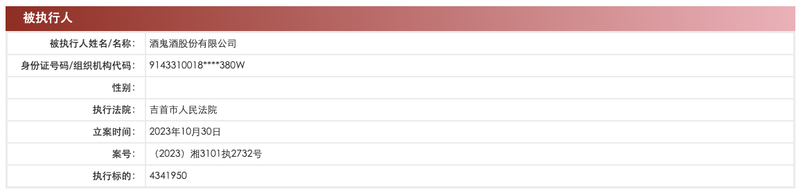 中国执行信息公开网显示,10月30日,酒鬼酒股份有限公司新增一则被执行人信息,执行标的434万余元,执行法院为吉首市人民法院。该公司成立于1997年7月,法定代表人为王浩,注册资本约3.2亿人民币,经营范围包括酒制品生产、酒类经营、饲料生产、旅游业务等,由中皇有限公司、香港中央结算有限公司等共同持股。