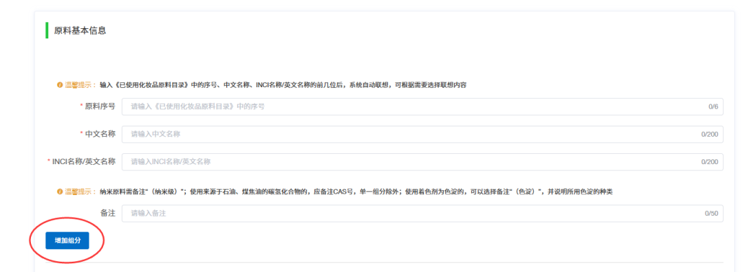 据多位行业人士介绍,今日上午,登录“原料安全信息登记平台”时发现,在“基本信息和工艺简述”板块的“原料基本信息”填报页面上,多了一个“增加组分”的按钮,点击该按钮进行操作后,发现原料可添加组分。这意味着,复配原料又可以报送了,原料报送恢复到了今年9月3日前的正常操作。