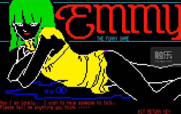 在人工智能技术和VR得到蓬勃发展的今天,这种玩法已经见怪不怪,甚至快要脱离非主流,成为一种固定的门类。但在1984年,《Emmy》可谓具有一定革命性:有游戏史研究者认为《Emmy》是历史上第一个Galgame,同时也是历史上第一个恋爱模拟游戏。《Emmy》甚至可以算是第一个人工智能游戏,当然,要接受这种说法,你就必须适应《Emmy》极其简陋的技术(“人工无能”)。别说追求“对话感”,假如没有攻略,玩家甚至很难解锁任何一张CG。