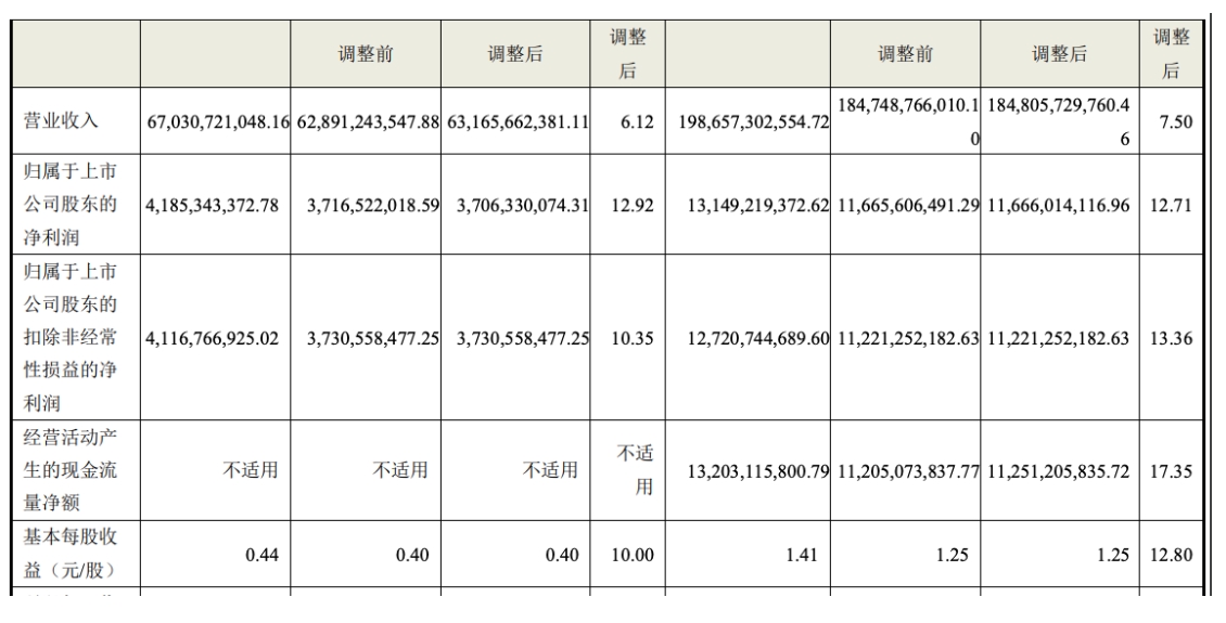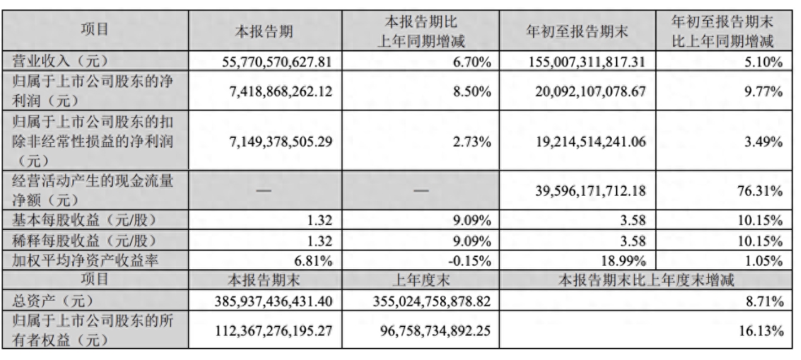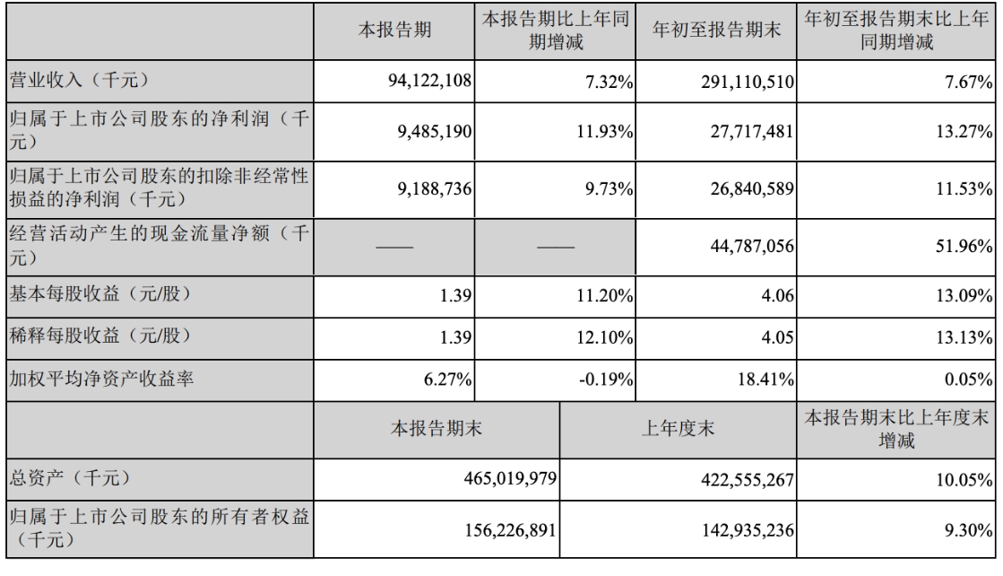 具体到三季度,公司三季度实现营收941亿元,同比增长7.32%,净利润约95亿元,同比增长约12%。