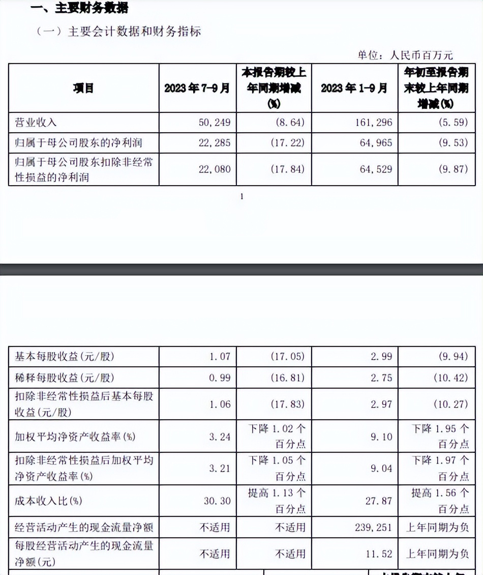 上述指标几乎没有不下滑的,唯一增长的是成本收入比,三季度为30.30%,同比提高1.13个百分点。
