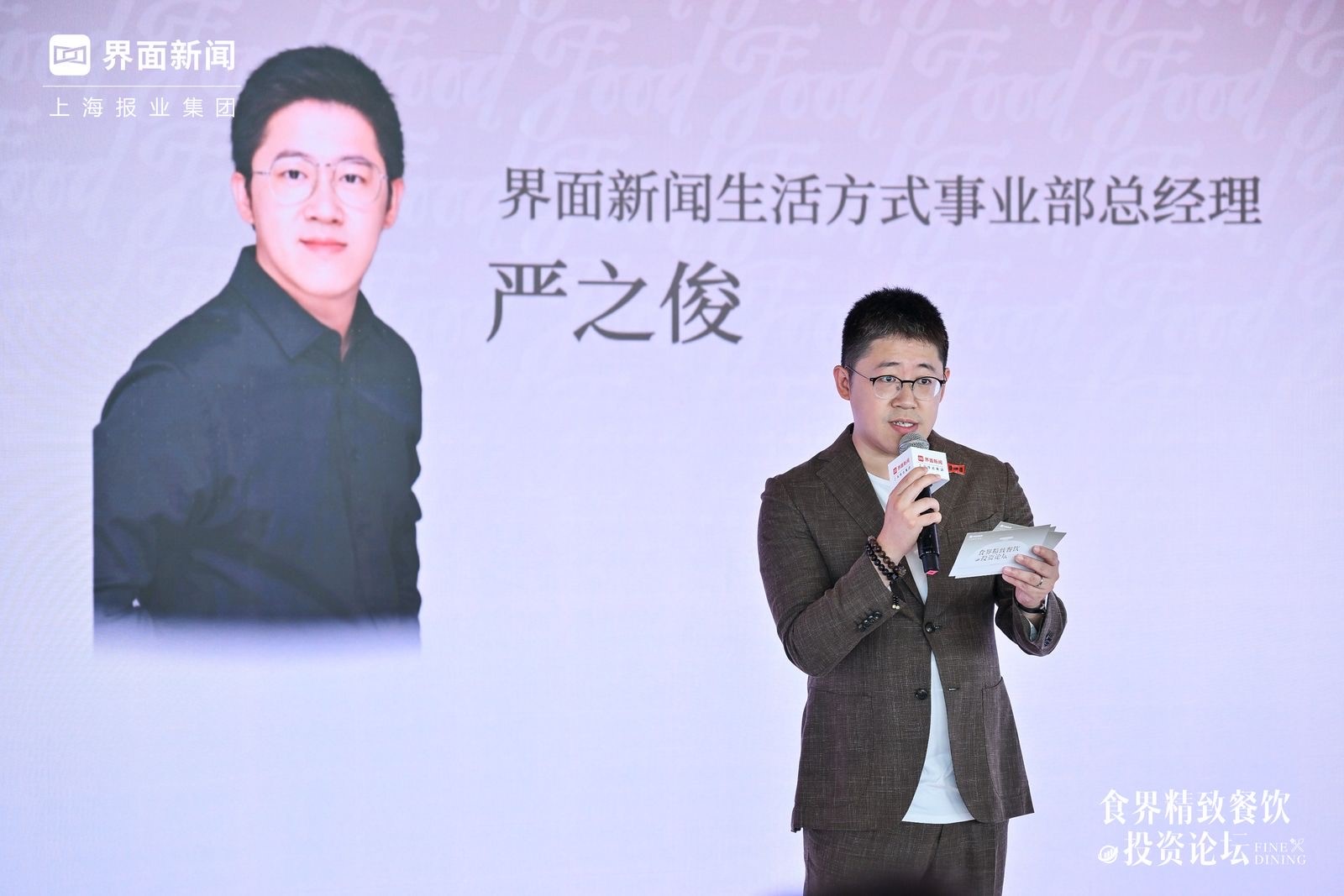 严之俊:各位嘉宾,女士们,先生们,大家下午好!感谢大家百忙之中来到“2023食界精致餐饮投资论坛”,我谨代表上海报业集团|界面新闻全体同事,表示最热烈的欢迎和最诚挚的敬意。