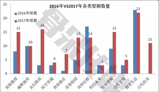 1) 从自制剧题材类型来看,2017年,幽默搞笑和科幻未来类数量将持平,奇妙幻想和都市生活类数量将减少,但都市生活类仍是市场主体类型。其余类型数量均有增加。