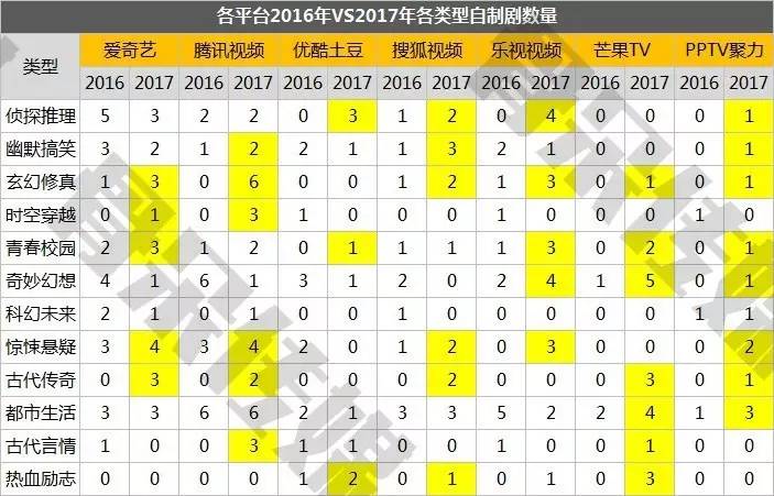 3) 优酷土豆:保持幽默搞笑类数量,新增侦探推理、青春校园、热血励志类;