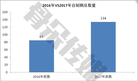 根据各平台公开信息搜集,2017年自制剧数量将达134部,较2016年几乎翻倍。