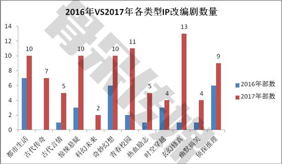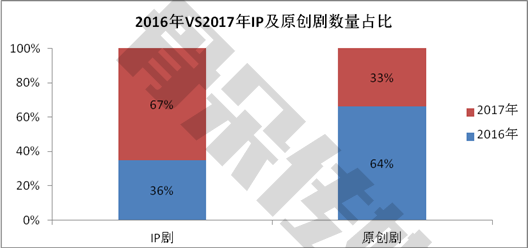 2) 从已知资料看,2017年IP改编剧目共90部,较2016年增加59部,占2017年自制剧总量的67%;而原创剧数量仅为44部,较2016年减少10部,占2017年自制剧总量的33%。