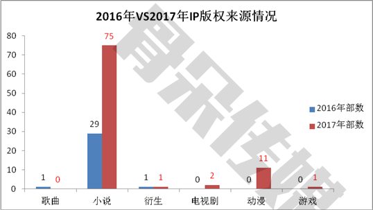 1) 小说改编仍是IP主流,2016年共29部小说改编自制剧,2017年,这一数字将超过75;